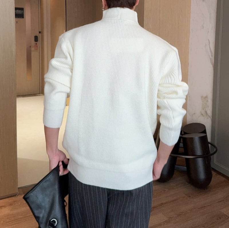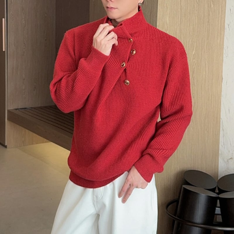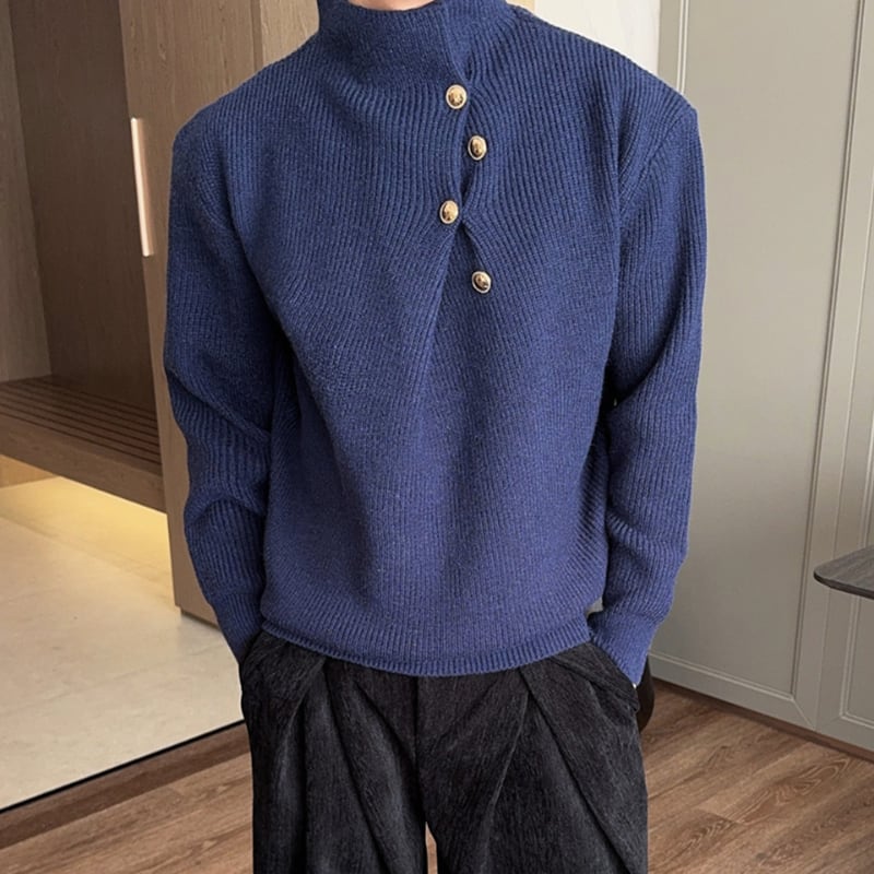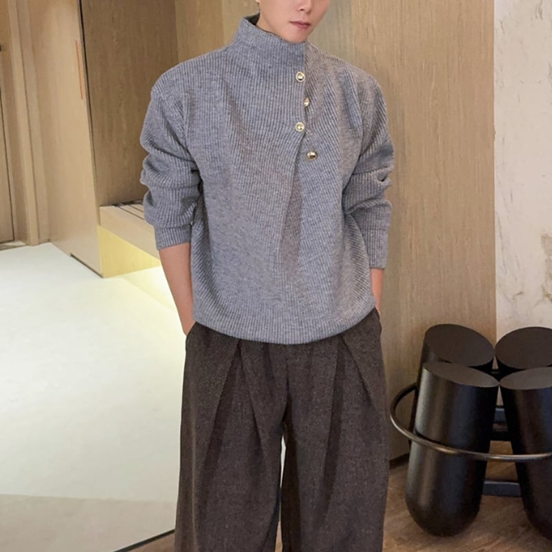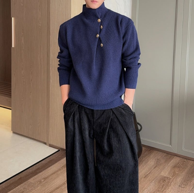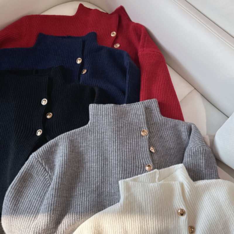 アシンメトリーボタン モックネックリブニット 5カラー LB1706